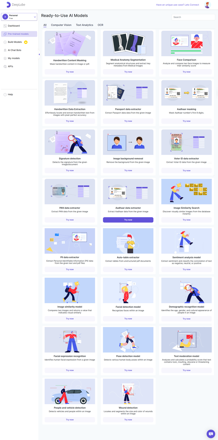 DeepLobe's pre-trained Aadhaar Data Extractor model is specifically designed to identify and extract key data from Aadhaar cards. This model can assist organizations in automating the extraction of crucial information such as Aadhaar number, name, address, date of birth, and gender, enhancing efficiency and accuracy in KYC processes, identity verification, and service delivery.