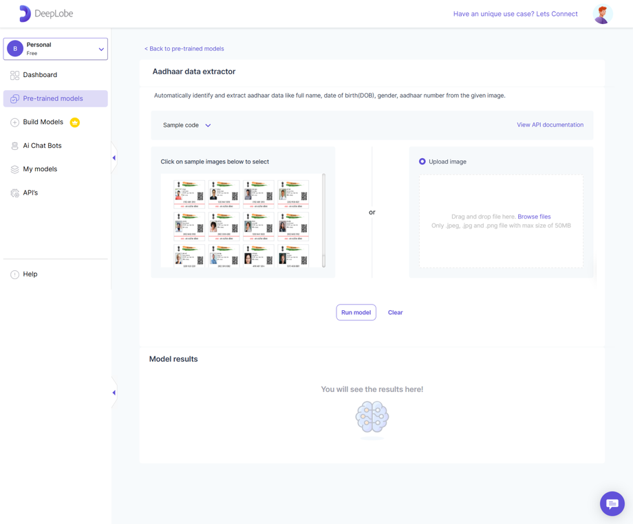For comprehensive information on using the Aadhaar Data Extractor model via the API, consult our API documentation. It provides detailed guidance and examples to help you effectively leverage the model within your applications.