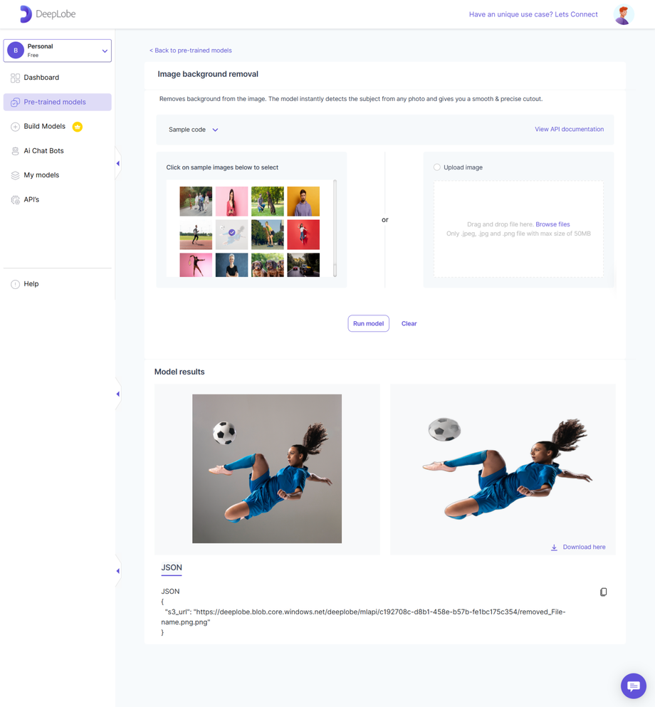 We hope the Image Background Removal model proves to be a valuable asset for your organization, enhancing your image processing capabilities and improving visual content. Should you have any questions or require further assistance regarding the Image Background Removal model or any other aspect of DeepLobe, please don't hesitate to reach out to our support team.
